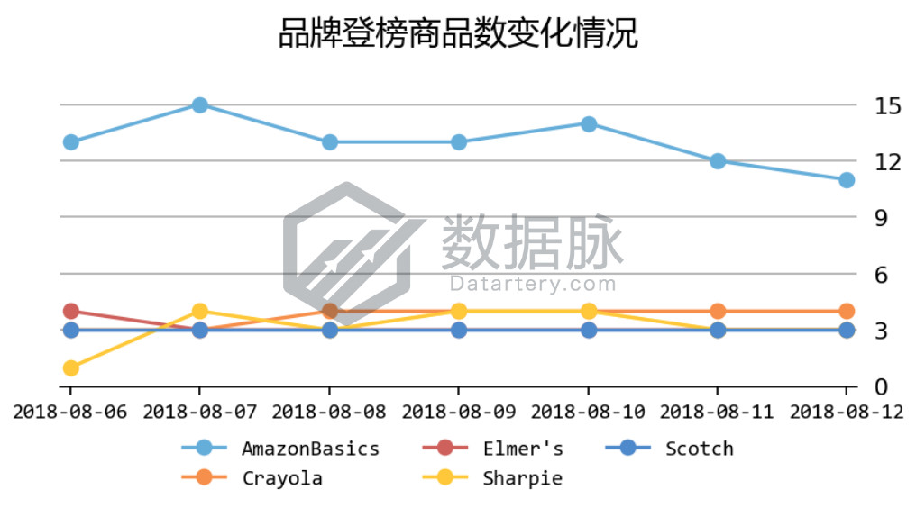 可以看到,在上周Office Products品类的Hot New Releases榜单中, 亚马逊自营品牌AmazonBasics发挥极强的品牌实力,每日至少登榜11款商品,总计91次的成绩位列品牌综合排名第一;品牌Crayola、Elmer's、Sharpie、Scotch登榜次数表现相近,分别位列品牌综合排名第二、三、四、五位。