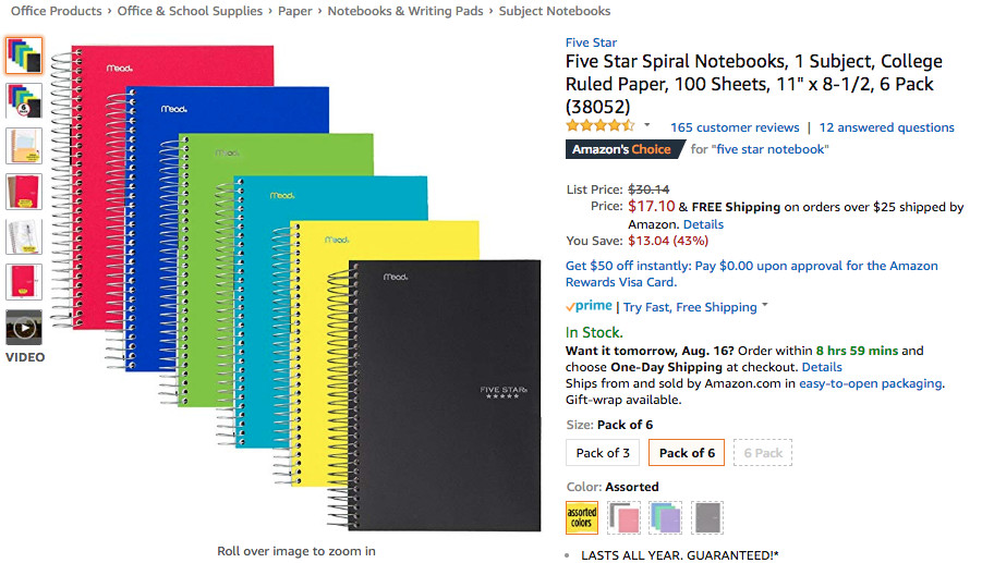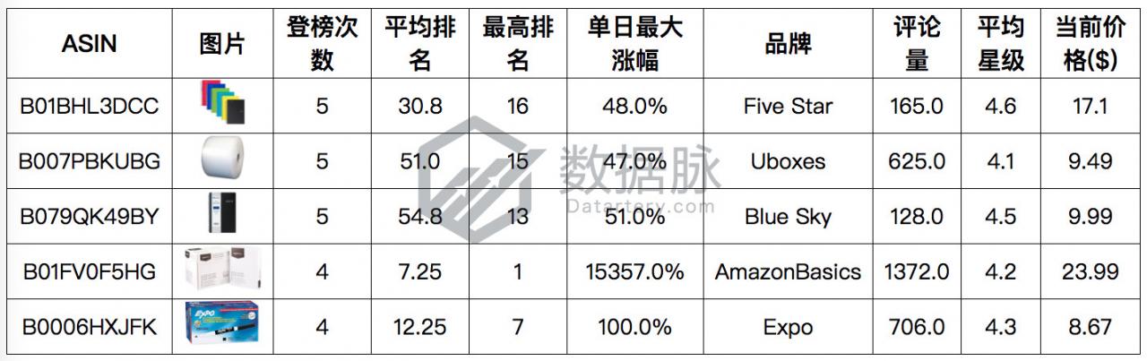 可以看到,在上周Office Products品类的Movers & Shakers榜单中, 品牌Five Star的笔记本登榜五次,并取得了平均排名30.8的出色成绩,占领了商品综合排名首位;