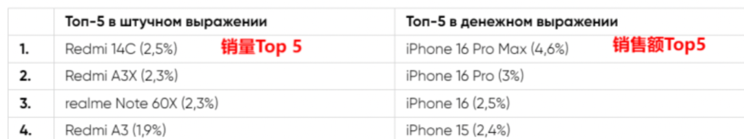 具体来看,销量最高的五款手机分别是Redmi 14C,份额占比2.5%;Redmi A3X,份额占比2.3%;Realme Note 60X,份额占比2.3%;Redmi A3,份额占比1.9%;Realme Note 60,份额占比1.6%。