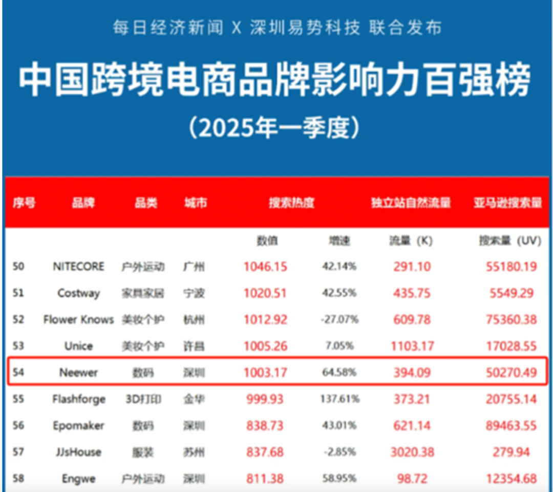 在每日经济新闻与深圳易势科技联合发布的《中国跨境电商品牌影响力百强榜》(2025年一季度)上,Neewer凭借其强大流量和卓越成就成功跻身榜单第54名,为深圳跨境圈增添了一份荣光。