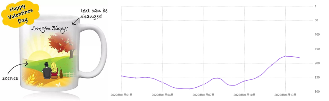 对于新手卖家而言,POD商品会更好进行节日化包装,而且可以进行POD差异化的商品种类较多,卖家选品较为方便。例如下图这款POD马克杯,近期已经开始进行情人节营销准备,BSR已经明显展现了上升趋势。