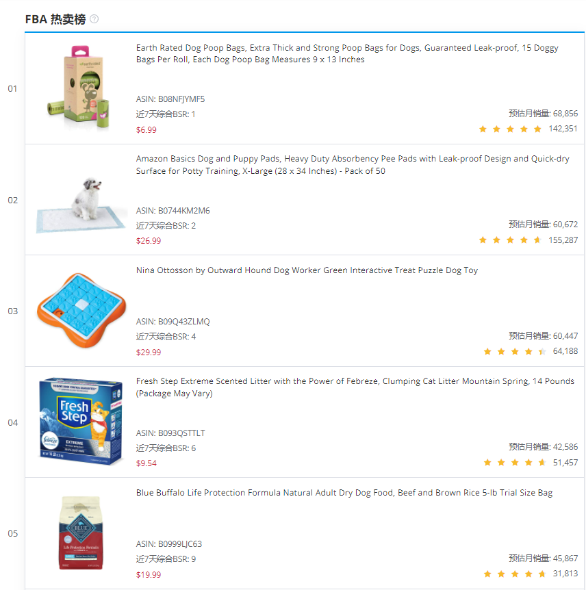 比如亚马逊平台宠物用品榜单中的常客拾便袋、尿垫、宠物厕所、猫砂等都是不错的选择,而宠物食品虽然商品特征符合要求,但是由于很多国家需要食品认证才可售卖,不建议轻易尝试。