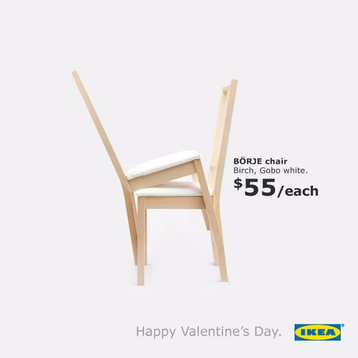 比如在2020年,宜家就投放了下图这张家具广告,不仅传递了买一赠一的促销信息,而且体现了亲密无间的感觉,很好地和情人节气氛相融合。