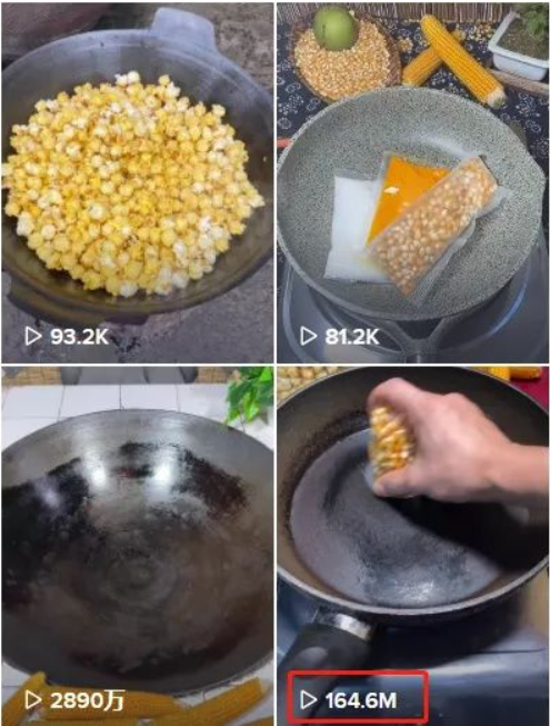 沉浸式带货适用品类较多,除宠物用品外,食品、厨具、运动、个护等品类均较为合适,比如下图为TikTok博主@popcornshow6为爆米花制作的沉浸式带货视频,该博主日常发送的视频主要是通过一个锅就可以炸出不同口味的爆米花,曝光率最高的也达到了164M以上。