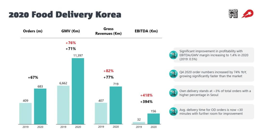 2021年,DeliveryHero以40亿美元的价格收购了Baemin的控股股权。这个收购引起了韩国监管的注意 - 为了完成这个收购,DeliveryHero被迫放弃了当时已经在他手下的韩国第二大平台Yogiyo(名字意思是”这里哟“),折腾了一年多才得到监管的批准。