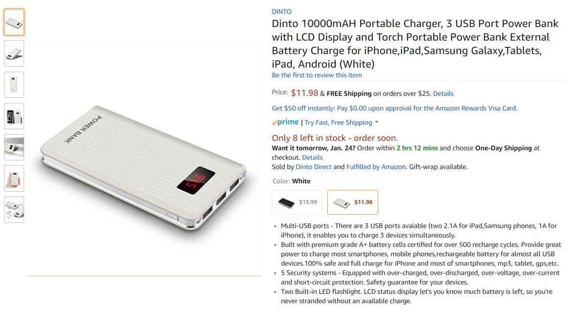 根据上述分析,我们来看案例中的产品标题:Dinto 10000mAH Portable Charger, 3 USB Port Power Bank with LCD Display and Torch Portable Power Bank External Battery Charge for iPhone,iPad,Samsung Galaxy,Tablets, iPad, Android (White)