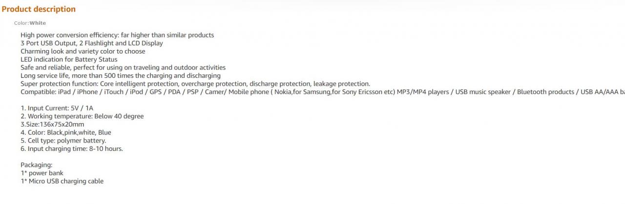 原标题中虽然包含了关键词(Portable Charger, Power Bank, External Battery),但在中间部分,过于匆忙的把几个关键词交叉连接在一起,有点显得关键词重叠,读起来美感尽失。在特性和属性方面的表达上,虽然使用了10000mAH, 3 USB Port, LCD Display, Torch等多个词语,但这些词语的组合没有从消费者的角度考虑消费者最关切的点,也没有考虑和各关键词分别结合,所以,虽然用了不少特性词,但行文平淡,平铺直叙且杂乱无章。当然,卖家其实也蛮用心的,在标题的最后添加了for iPhone等等,表面上看是适用范围,其实这些后缀词和前边的核心关键词组合,又形成了新的关键词,可以覆盖到更多搜索的用户。