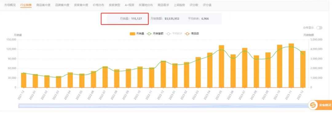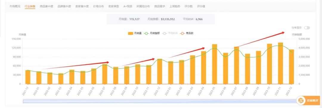 市场发展趋势也是在分析市场时候重点考量的一个范围,看下图:可以看到整体市场一直是处于正增长的状态,如果我们的品类一直走下坡路,那么不管我们咋怎么推,退到BSR1也是亏损或者投产不成正比。