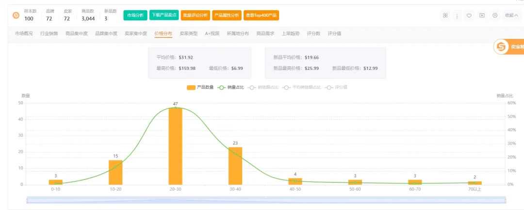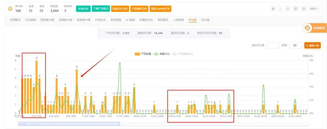 评价数量越多,准入门槛越大,证明我们需要足够的订单量才有机会进入前100名,一般我来评判的标准是1000、2000, 另外也会观察低于1000评论的listing数量占比和市场占比具体是多少来评判。