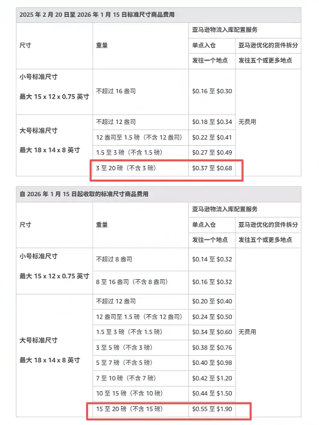 旧规:大号标准尺寸商品(最大18×14×8 英寸)的 “3至20磅(不含3磅)” 仅设1个区间,入库配置服务费为$0.37至$0.68;