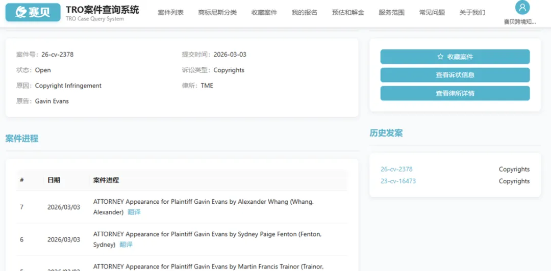 从赛贝TRO案件查询系统获悉,美国伊利诺伊州法院立案受理一起重大版权侵权诉讼案件号:26-cv-02378,原告为世界知名摄影师Gavin Evans,由TME Law, P.C.(简称TME律所)代理,核心诉求为打击涉嫌侵权的跨境电商卖家,并已启动临时限制令(TRO)申请相关流程。