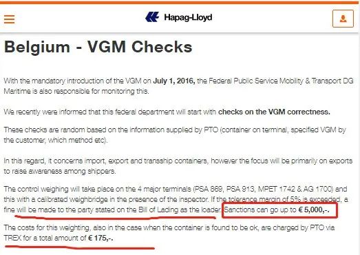 日前比利时、孟加拉等国开始实施集装箱重量VGM检查,事实上去年包括马士基、地中海、长荣等船公司也发布VGM错报、瞒报将收取罚金的公告;我国交通运输部去年6月也颁布相关规则修改的决定,提醒超重不得装船,违者罚款或负法律责任!