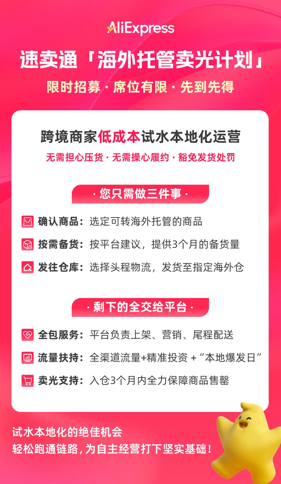 速卖通「海外托管卖光计划」已经开启限时招募,席位有限,先到先得。