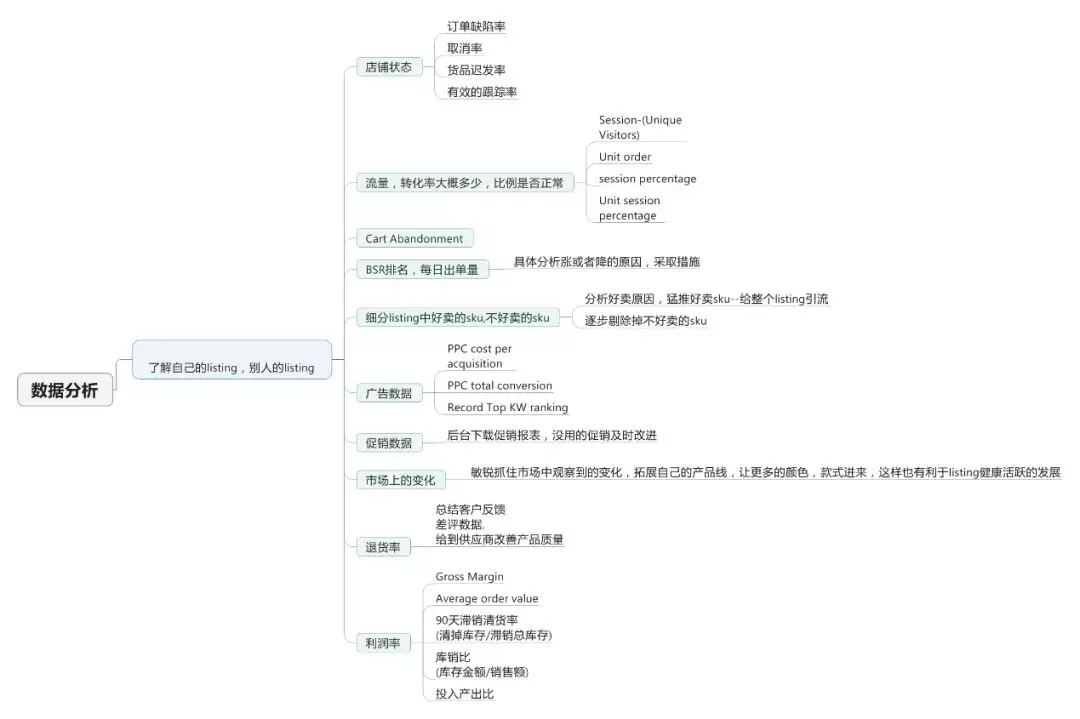 其中数据分析是小编认为在亚马逊工作中那20%非常重要的事情,日常运营很多工作都离不开它,不关注数据,运营就失去了基础。俗话说知己知彼,百战不殆,数据分析也一样,通过了解自己的listing,了解竞争对手的listing, 查找比对想办法控制一切自己能控制的,尝试各种可能,优化到位,结果一定不会太差的。具体数据分析参数可参考下面的导图: