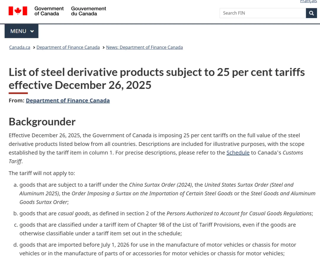 2025年11月底加拿大政府宣布了一项重磅政策:从12月26日起,对全球所有国家 (无国别歧视)一系列钢铁衍生产品加征25%的新关税。