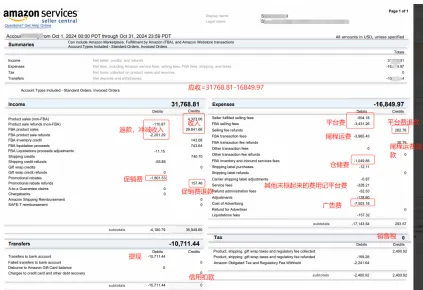 这两项合计 $34,175.05,是卖家在亚马逊平台上的总销售额(Gross Sales)。但很多卖家在申报时,可能只申报了“Transfers to bank account”的净提现金额,或者只申报了扣除所有费用后的“净利润”。但税务局会比对境内申报的增值税和企业所得税的销售收入是否与这个$34,175.05的金额匹配。
