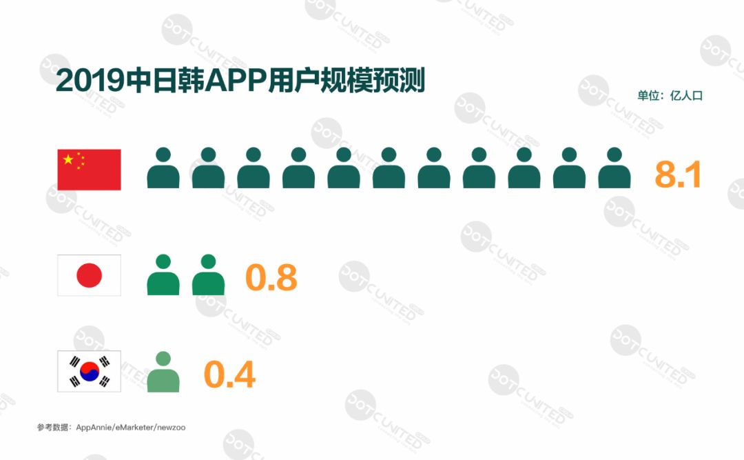 有数据显示,2019 年中国 APP(包括游戏和非游戏)市场规模有望突破 300 亿美元,将继续领跑东亚市场,日本和韩国也分别达到 142 亿美元和 42 亿美元的市场规模。