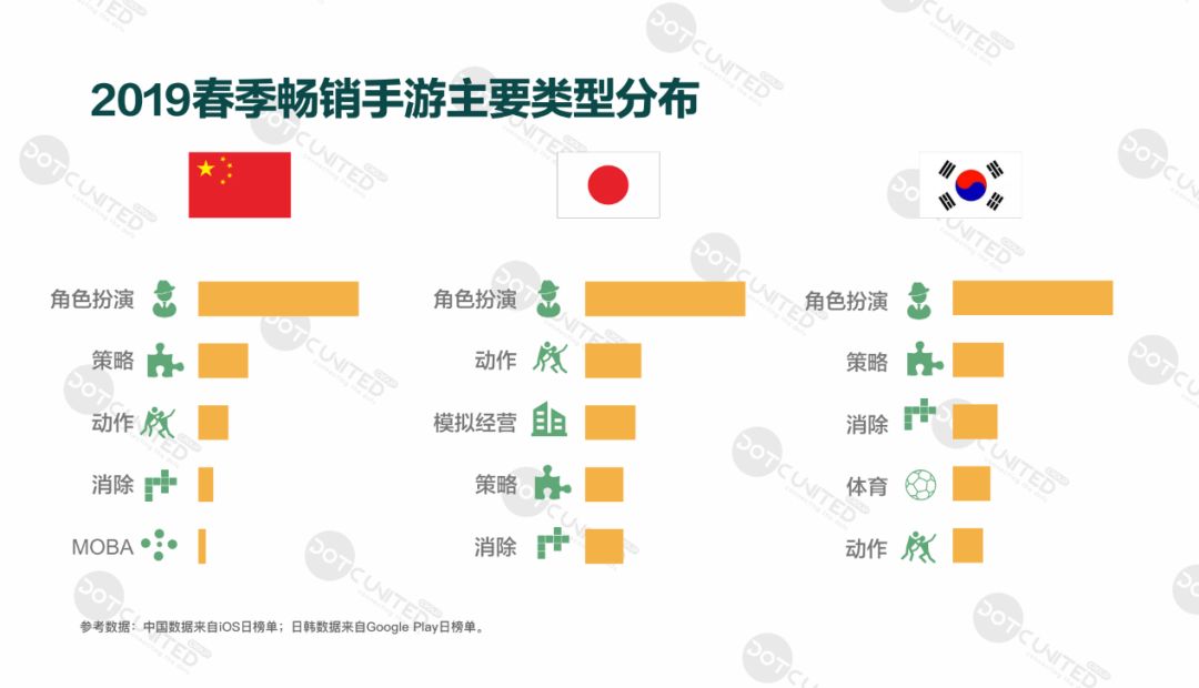 纵观 2019 年第一季度中日韩三国畅销手游类型分布,角色扮演清一色压倒性领先其他各品类。角色扮演一直都是整个游戏市场最大的收入驱动,亚洲作为角色扮演游戏的主战场,不同国家之间角色扮演游戏的特点也不尽相同。