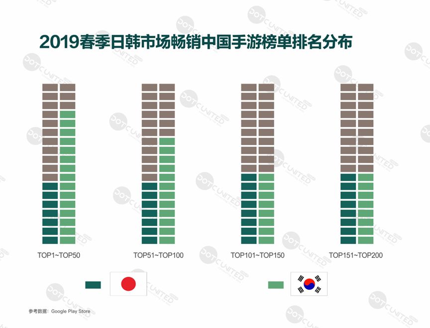 在日韩 Google Play 畅销手游日榜单 TOP200 中,来自中国的手游都占有极其重要的地位。日本 TOP200 中约有 30 款中国手游,TOP50 中占有 7~8 个席位。2019 年第一季度,MOBA 手游《荒野行动》继续领衔日本市场上的中国手游队列,成为日本玩家最爱的吃鸡手游。韩国 TOP200 中有超过 40 款中国手游,主要集中分布在 TOP100 内,武侠手游《九州侠客传》以黑马之势成为第一季度在韩国市场最受欢迎的中国手游。