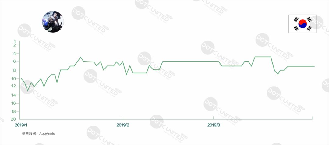 韩国市场有着特别显著的收入头部集中的马太效应,在过去的 2018 年,韩国 TOP10 手游年收入几乎占整个手游市场收入的一半,而年度收入第一名的《天堂M》就占到手游市场的 22%,这点从 2019 年第一季度的榜单排名情况也可窥一斑,整个季度始终保持第一的这种稳定霸气的排名走势,在其他国家极为少见,《天堂 M》可谓韩国手游市场的无敌霸主。