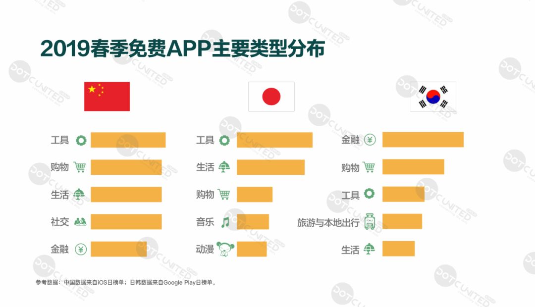 纵观 2019 年第一季度中日韩三国免费 APP 类型分布,整体来说,工具、购物和生活类具有普适性。从国别来看,“刚需”工具类登顶中日 APP 类型榜首,相较之下,韩国 APP 类型“金融”特色显著。