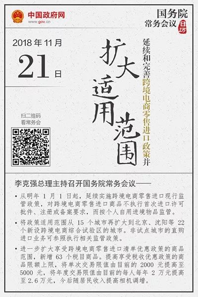 李克强总理11月21日主持召开国务院常务会议决定:延续和完善跨境电子商务零售进口政策并扩大适用范围。