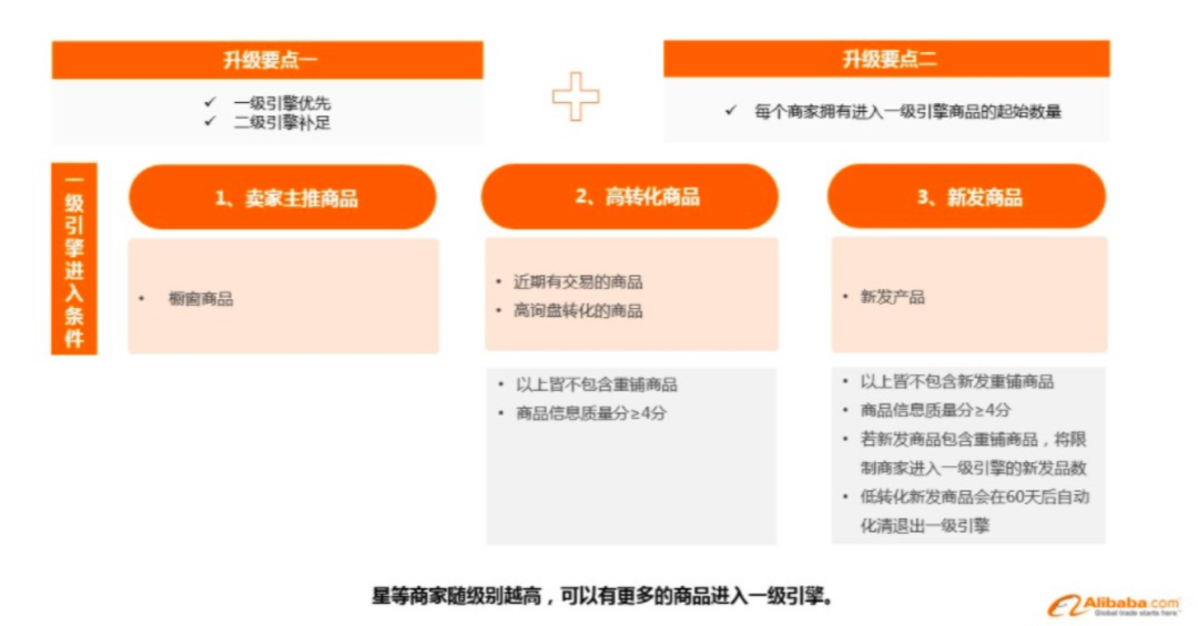 升级一二级搜索引擎,橱窗产品,高转化产品(近期有交易的产品,高询盘转化的产品)以及新发产品, 这三类产品优先准入【产品信息质量分大于等于4分,商家星等级越高,可以有更多产品进入一级引擎】
