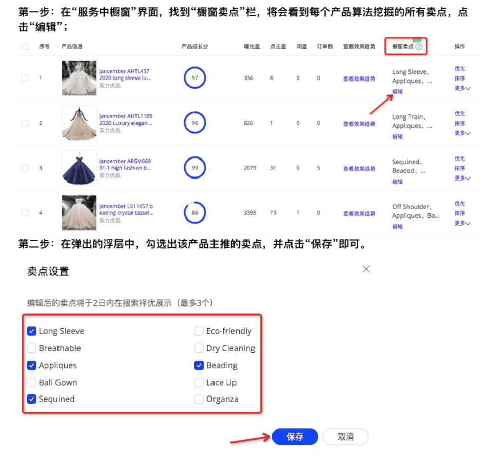 对商家开放的橱窗产品的卖点设置功能,操作界面如下: