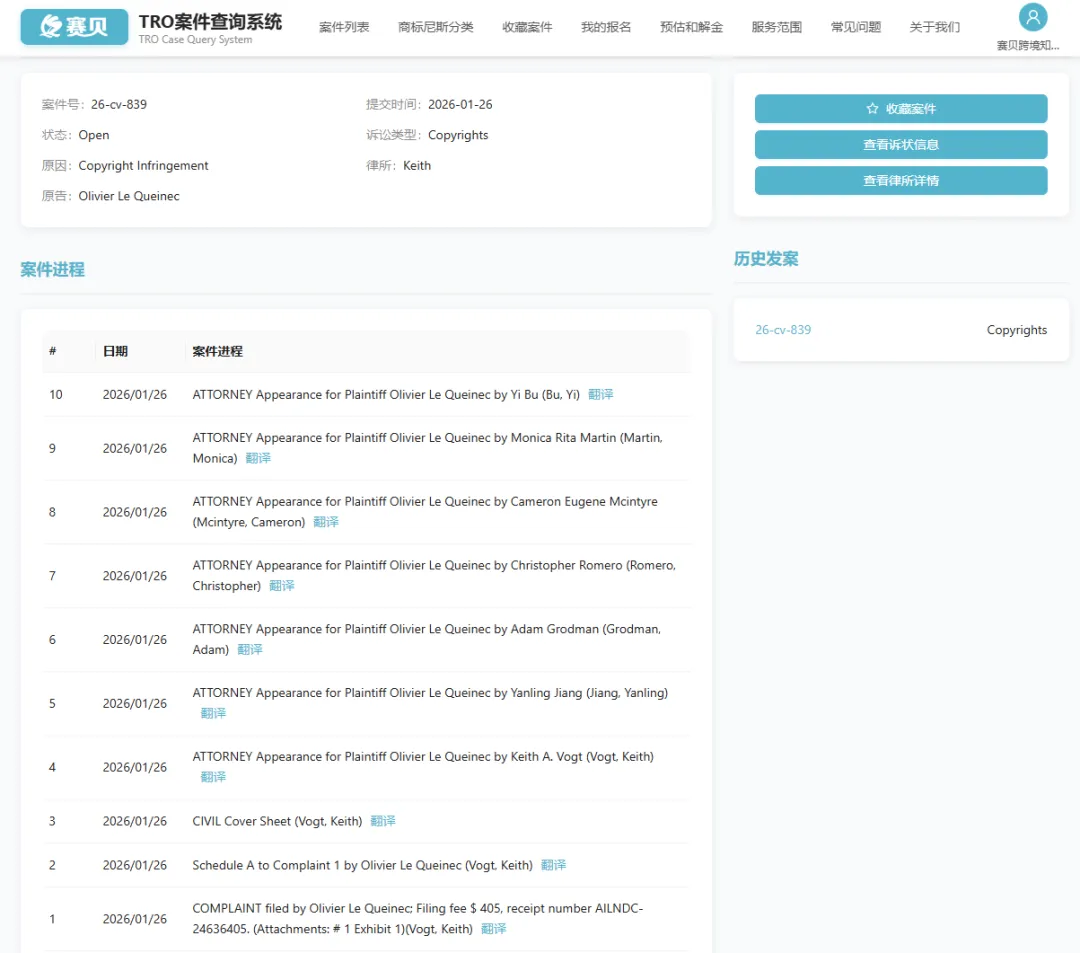 【26-cv-839】2026 年首例摄影作品 TRO 突袭,原告OLIVIER LE QUEINEC委托Keith律所代理,在伊洲发起8张作品版权侵权诉讼。