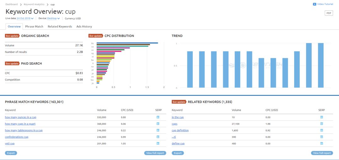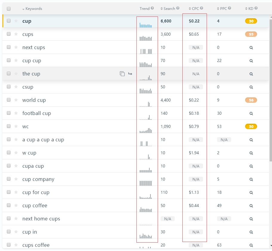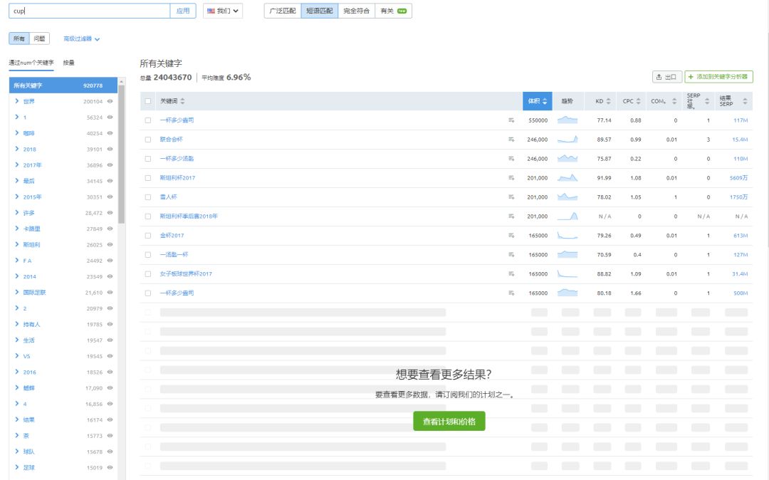 第三步我假设输入关键词cup会出现各种数据,还有cpc等