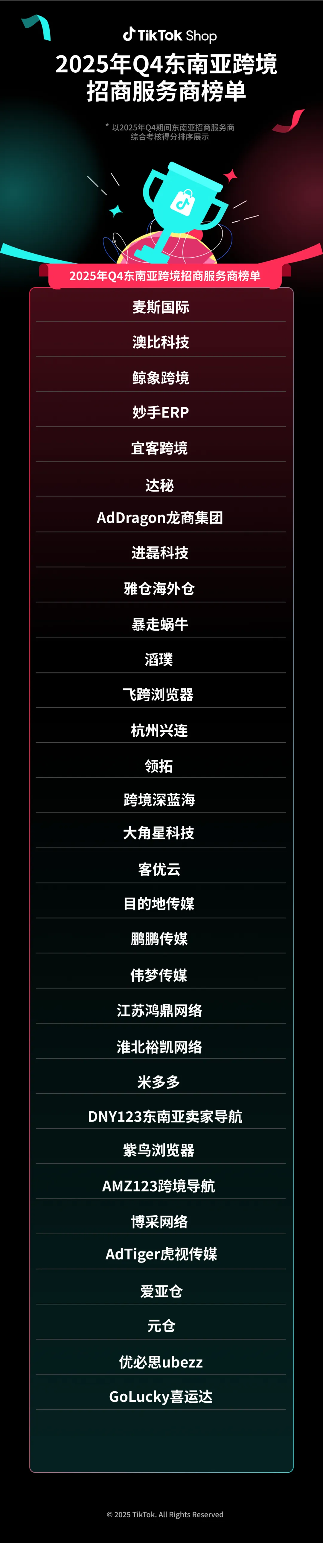 这份榜单既是对 Q4 优秀招商服务商的权威认可,更是 2025 年 TikTok Shop 东南亚跨境招商生态实力的集中彰显。值此重要节点,诚邀您一同解锁这份榜单的招商服务商风采!