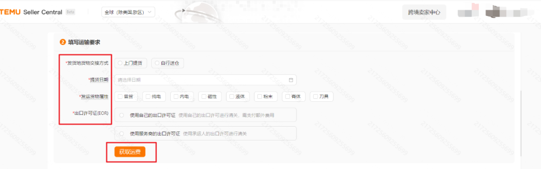 填写发货日期,选择发货方式(上门提货/自行送仓),并通过平台获取运费报价。