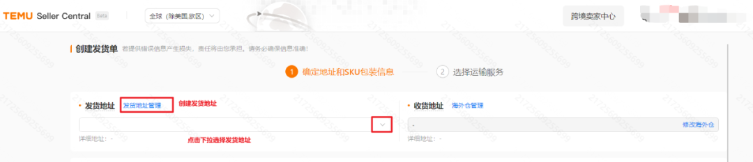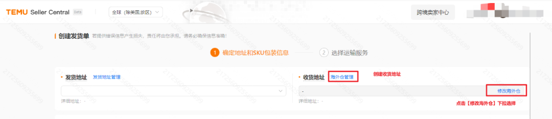 创建或选择【发货地址】和【收货仓库】,点击[修改海外仓],选择美设跨境的海外仓,轻松搞定仓库位置。