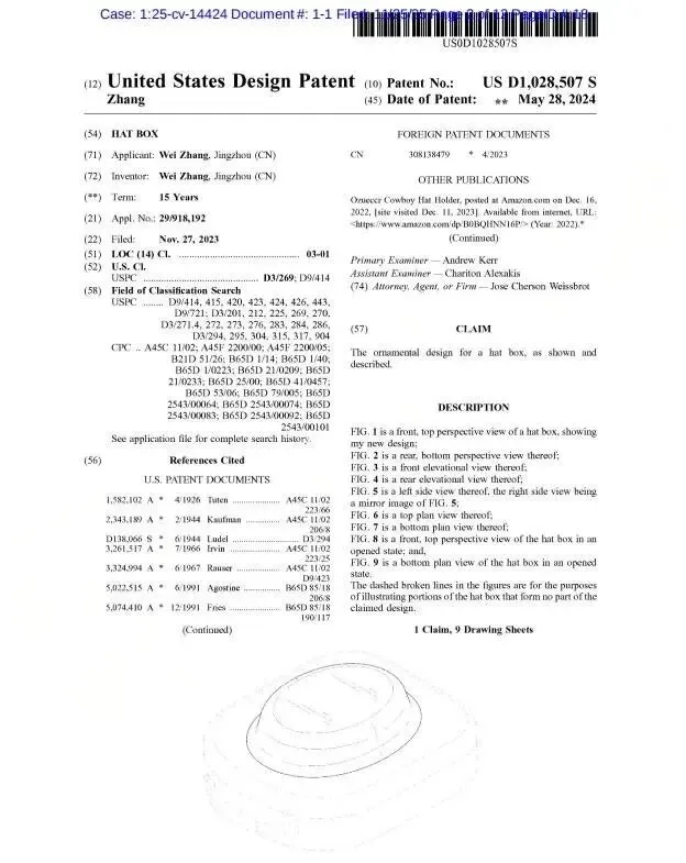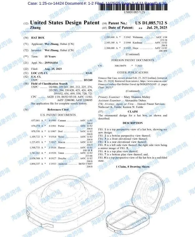 专利维权25-cv-14424防压帽盒专利和25-cv-12345人体工学腰枕和25-cv-23747清洁刷专利
