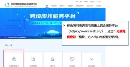 登录深圳市跨境电商线上综合服务平台(https://www.szceb.cn/),点击”无票免税登记“模块,进入出口免税登记界面。