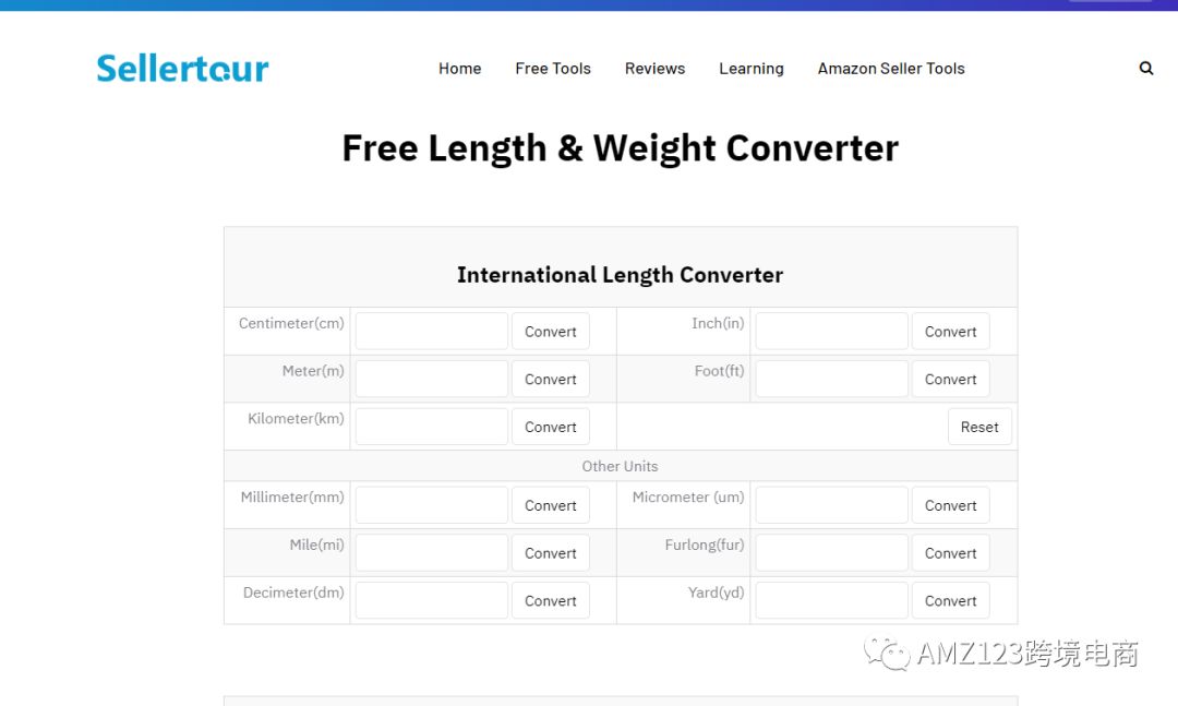 卖家常常要用的一个工具是单位换算,Sellertour提供长度和重量换算功能,网址是:https://sellertour.com/free-length-weight-converter/。一个面板集合了所有单位,不需要你来回切换: