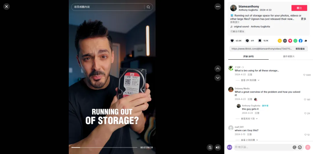 绿联与TikTok数码测评博主@blameanthony 合作,以 “创作者工作流痛点” 为核心,打造深度实测类内容,全面释放 NASync 系列的专业性能优势。