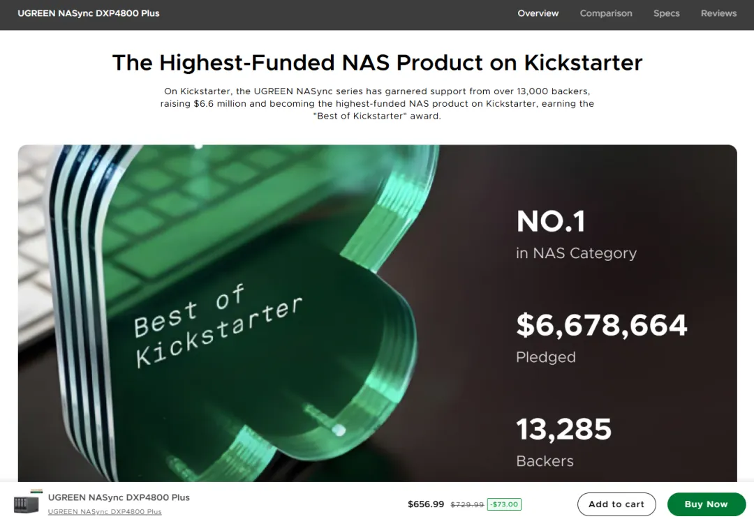 2024年3月26日,绿联在Kickstarter上线NASync DXP系列众筹,目标仅2万美元,最终却狂揽667.87万美元,超额333倍,成为平台史上融资最高的NAS项目,还拿下 “Best of Kickstarter” 官方认证;