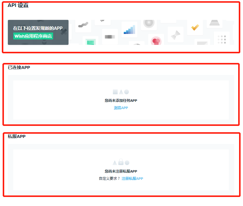 点击“API设置”文字下方的图片,你就可以进入之前介绍的Wish App Store页面上,各位商户可以浏览、搜索到Wish基于Wish API服务条款、政策、流程,谨慎审查并认可的受信任的公服APP。