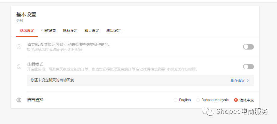 Shopee马来本土店铺跟我们的跨境店铺后台基本上是一致的。后台支持中文/英文,登录无需VPN