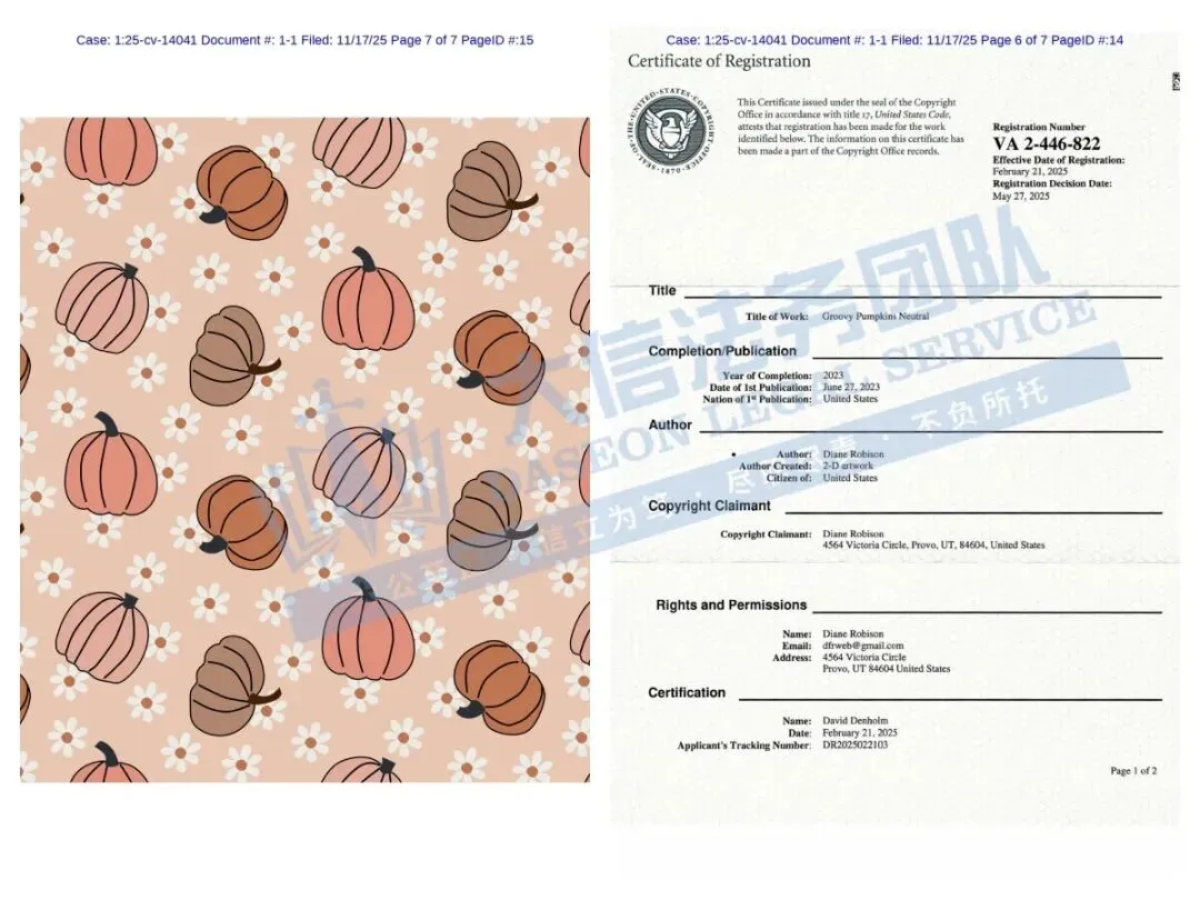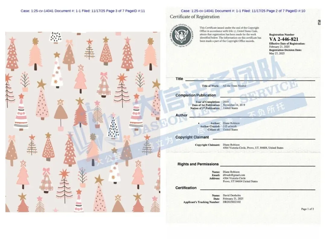此案为版权维权,共涉及4张版权画作。版权号:VA 2-453-703、VA 2-453-702、VA 2-453-333、VA 2-456-770,均于2025年5月2日下证,下证即维权,以下是相关版权的具体信息,未经授权不得擅自使用,跨境卖家尽快检索下架,否则会有TRO侵权风险!