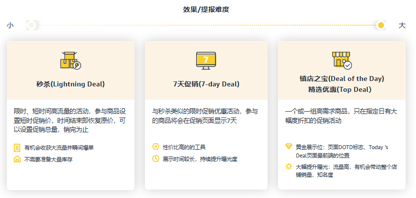 亚马逊网站上有各种提高商品能见度的促销活动。参加的商品可以显示在Today’s Deal页面,获得额外的流量。常见的Deal促销有秒杀(Lightning Deal)、7天促销(7-day Deal)、和镇店之宝(Deal of the Day),通过活动不仅能帮助卖家在短期内冲击销量,也能获得流量和知名度,优化店铺运营。