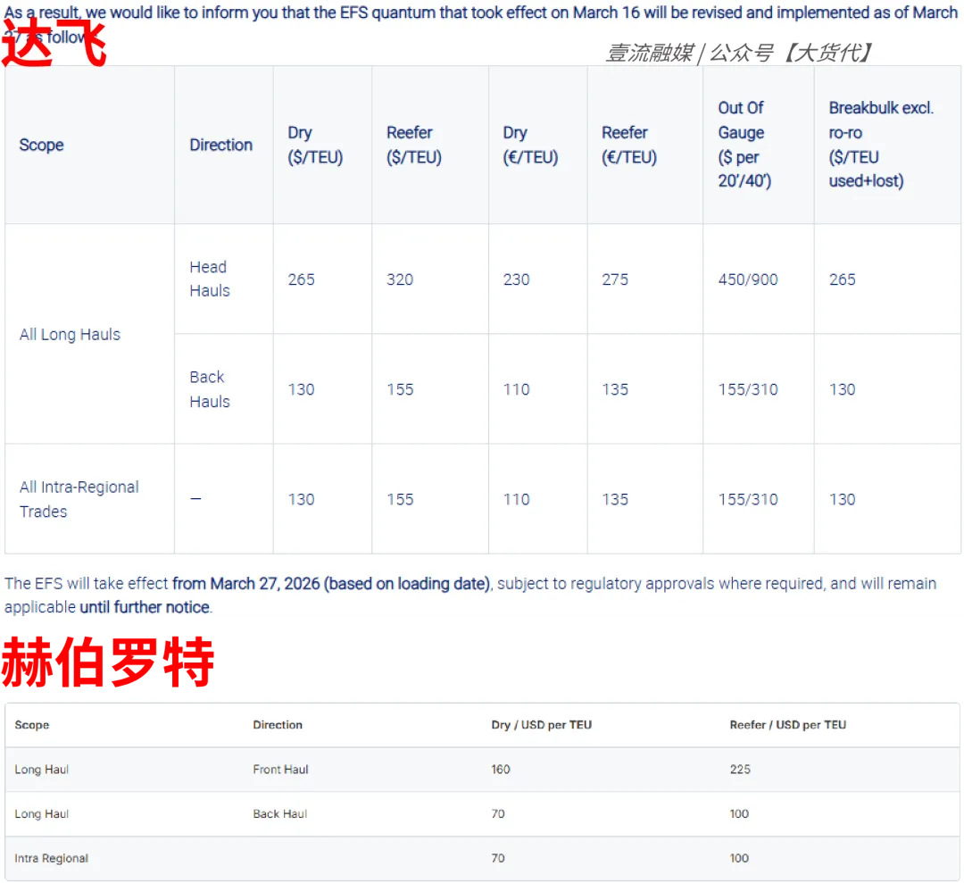 Hapag-Lloyd赫伯罗特——宣布于3月23日起对全球所有贸易航线的费用调整(受美国FMC监管航线为4月8日)。其长航线主航向加收标准为干箱160美元/TEU,冷藏箱225美元/TEU。