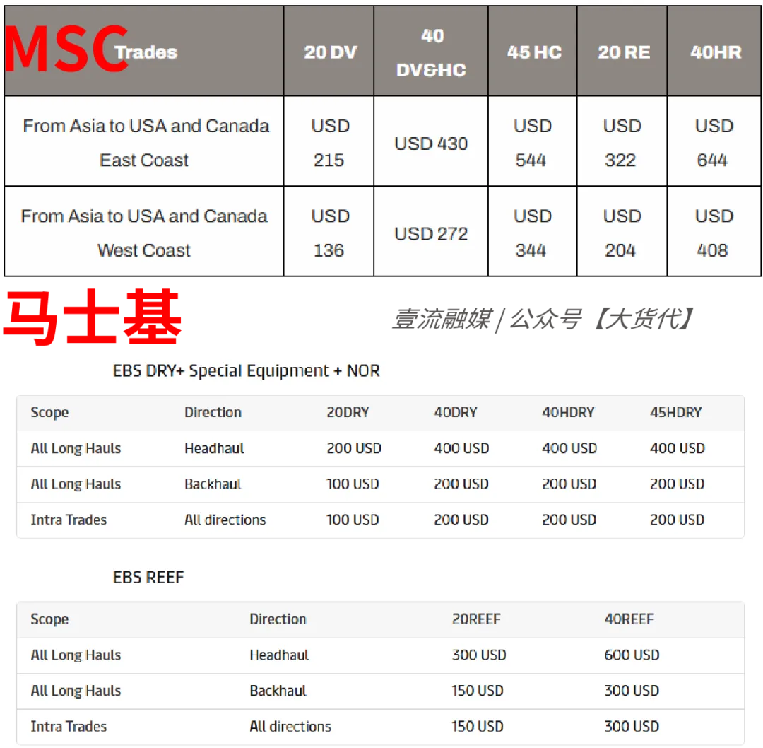 MSC地中海航运——宣布3月16日起对亚洲至美国及加拿大的航线征收,收费标准从136美元到644美元不等。