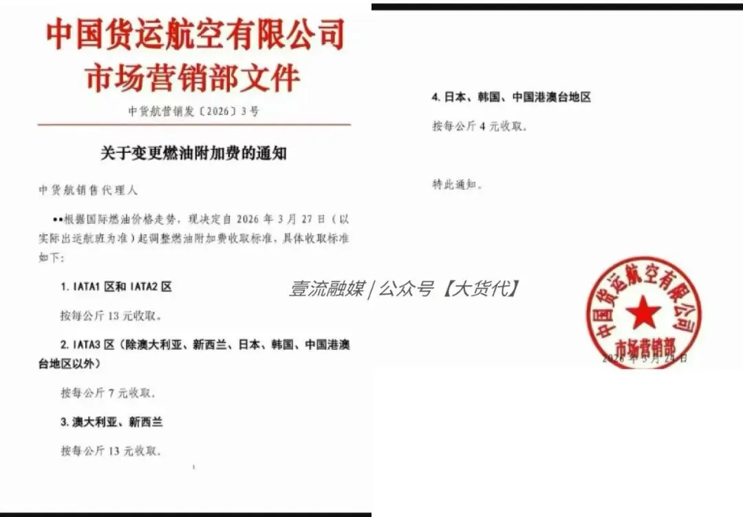 空运方面,行业预计4月份全球航空燃油价格将持续上涨,预计环比涨幅达12%-15%,且中货航目前也是已宣布自2026年3月27日(以实际出运航班为准)起调整燃油附加费收取标准。