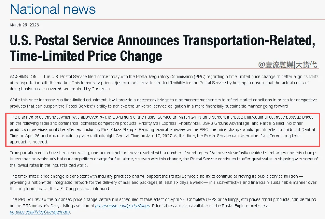 具体而言,受影响的服务包括:优先邮件快递 (Priority Mail Express)、优先邮件 (Priority Mail)、美国邮政地面优势服务 (USPS Ground Advantage) 和包裹选择服务 (Parcel Select)。