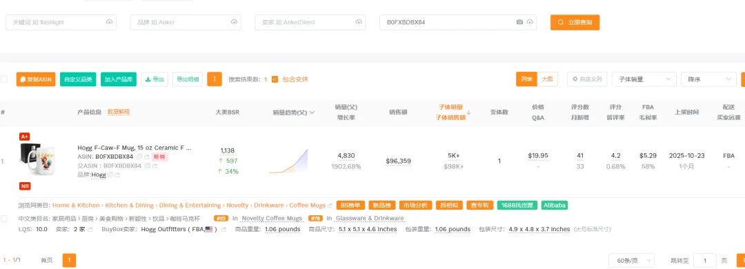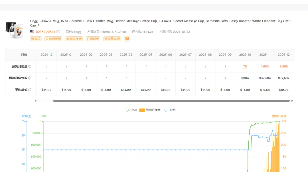 总结:排名数据证明该产品已成功切入一个细分市场(新奇咖啡杯),并迅速成为头部卖家,获得了亚马逊系统的重点流量推荐。