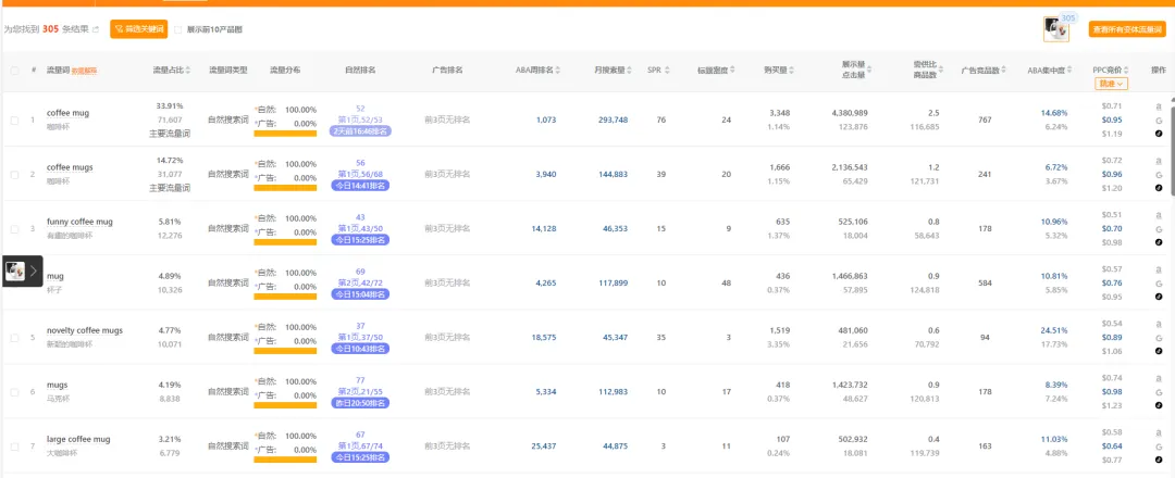 咖啡杯)搜索量巨大(例:14,128)但排名靠后(第1页43/50),实际获取的流量和转化有限;而一些中等流量的属性词(搜索量3,940)排名更靠前(第1页第5-6位),可能是真正的出单词。流量结构风险: