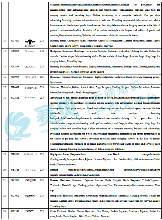“EKOUAER”、“ZEAGOO”等,涵盖第25类(服装等)、18类(背包等)、28类(玩具等)、35类(广告等服务)多个类别。