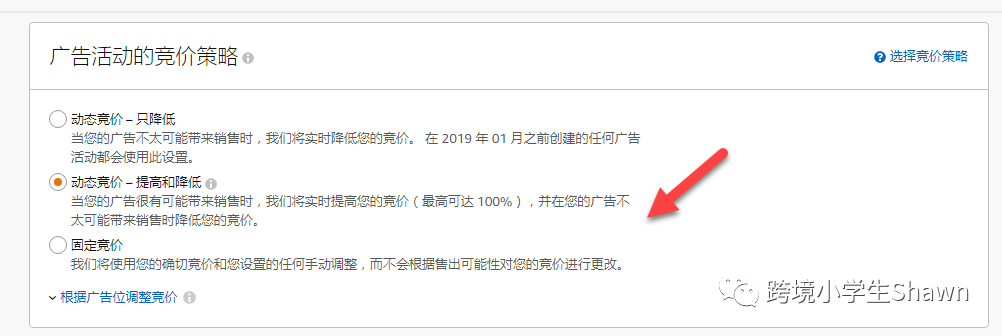 近期大家在开启自动广告时,不知道有没有注意到,系统会默认给我们自动广告的竞价策略选择“动态竞价中-提高和降低”